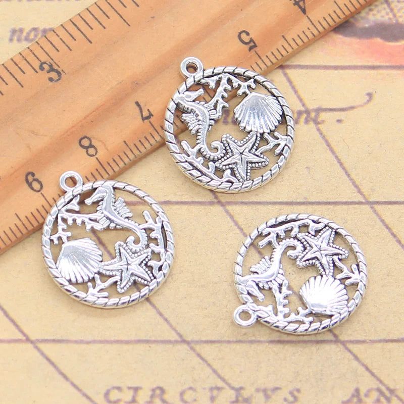 10 Uds. De dijes de océano, caballito de mar, estrella de mar, concha de vieira, 23x20mm, colgantes de Color plata antigua, fabricación DIY, búsqueda tibetana hecha a mano