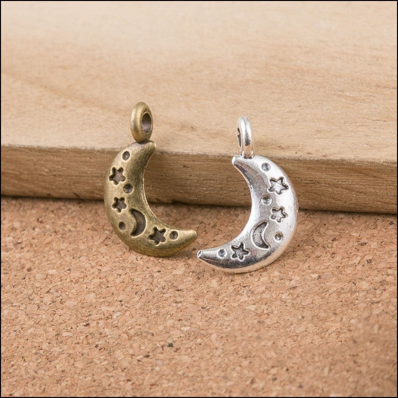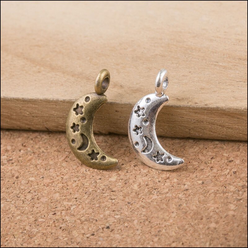 High Quality 50 Pieces/Lot 10mm*19mm Antique Bronze Antique Silver Plated Small Moon Alloy Charms For DIY Jewelry Making